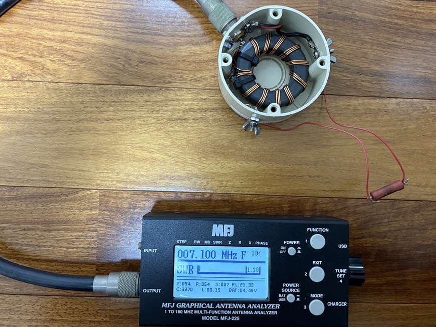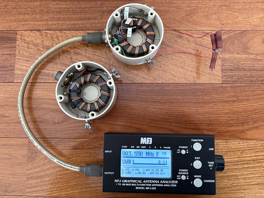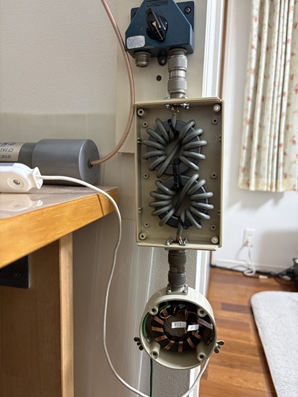 アンテナの長さは任意長であるため、どうしても同軸ケーブルのシールド部分に電波が乗るためコモンモードフィルターを整合回路の直下にとりつける。